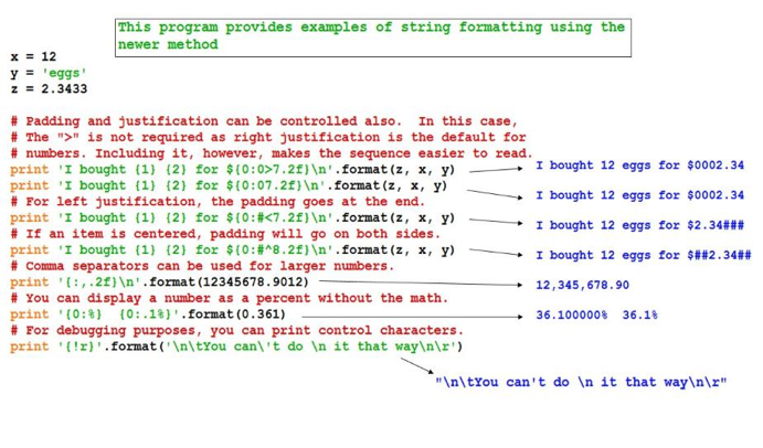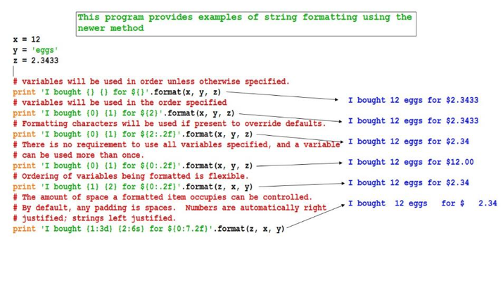 x, y = y, x x = 'Some text {} more text {}'.format(12, 17.426)